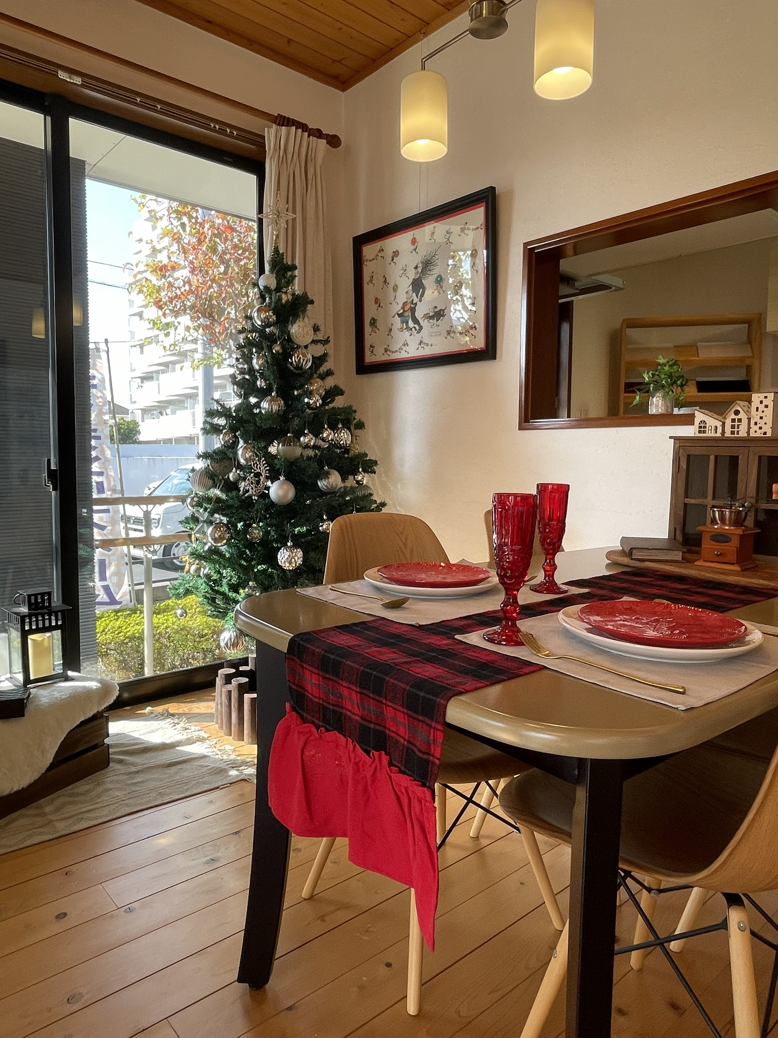 テーブルコーディネートも、赤いグラスやチェック柄のランナーなど、クリスマスの雰囲気にぴったりなスタイルに。
