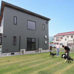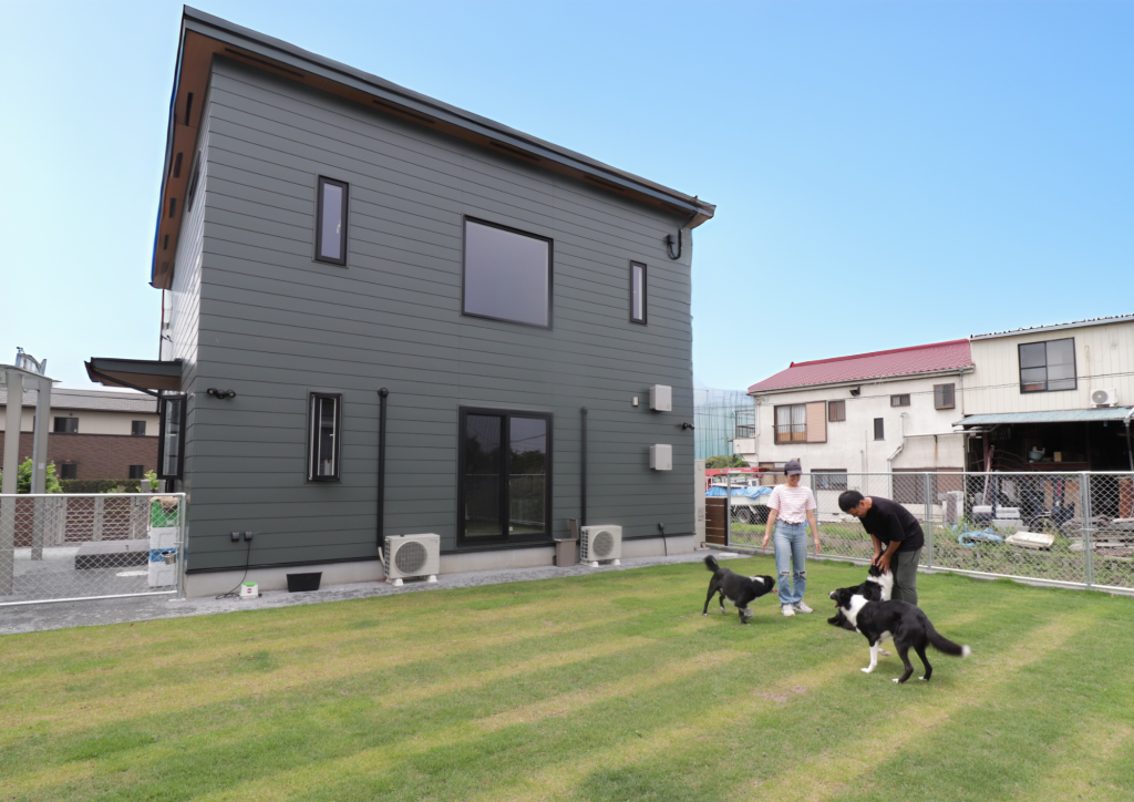 ワンちゃんと一緒に暮らすお洒落ハウスです。照明計画にもこだわり、落ち着いた室内空間を演出しています。スイッチ一つにしてもこだわりをもって、タンブラスイッチを採用。北側の美しい景色を見ながら家事ができるように大きな窓を設けています。吹抜も2か所設けることにより、縦の抜け感を感じられることできます。また、雨の日でも濡れることなく玄関へ入れるように外構計画にもこだわりました。広いお庭はわんちゃんがのびのびと走り回れるスペースとなっています。2階には多目的に使えるセカンドリビングを設けて暮らしの幅も広がりました。